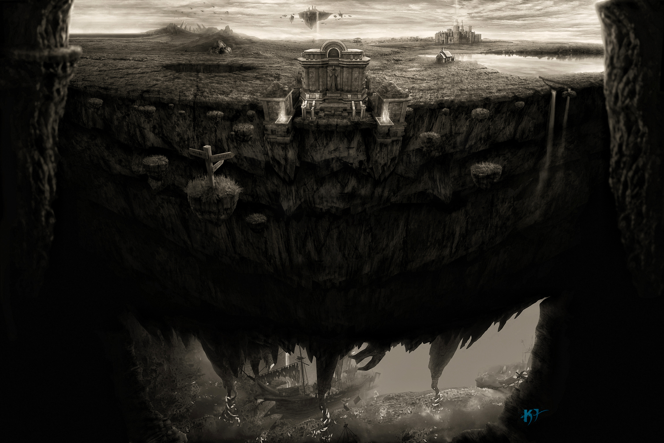 всё обрисовывалось, подгонялось и лепилось мной. большая часть моментов не имеют изначальных фот, они рисовались с нуля, как например остров и часть замка, светящиеся скалы и обрыв...