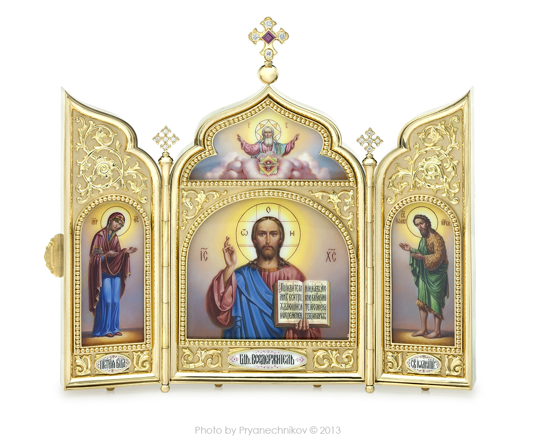 Складень «Православный». ©«Мастерская Агафонова». Золото 750°, вес 530.05 г. Горячая эмаль, роспись по горячей эмали, Рубин-0.33 ct, 14 бриллиантов Кр57-0.36 ct 3/3А, h=125 mm. Photography of High Jewellery and Precious Gems. Photo by Pryanechnikov ©2013 (Фото Сергей Прянечников © 2013).