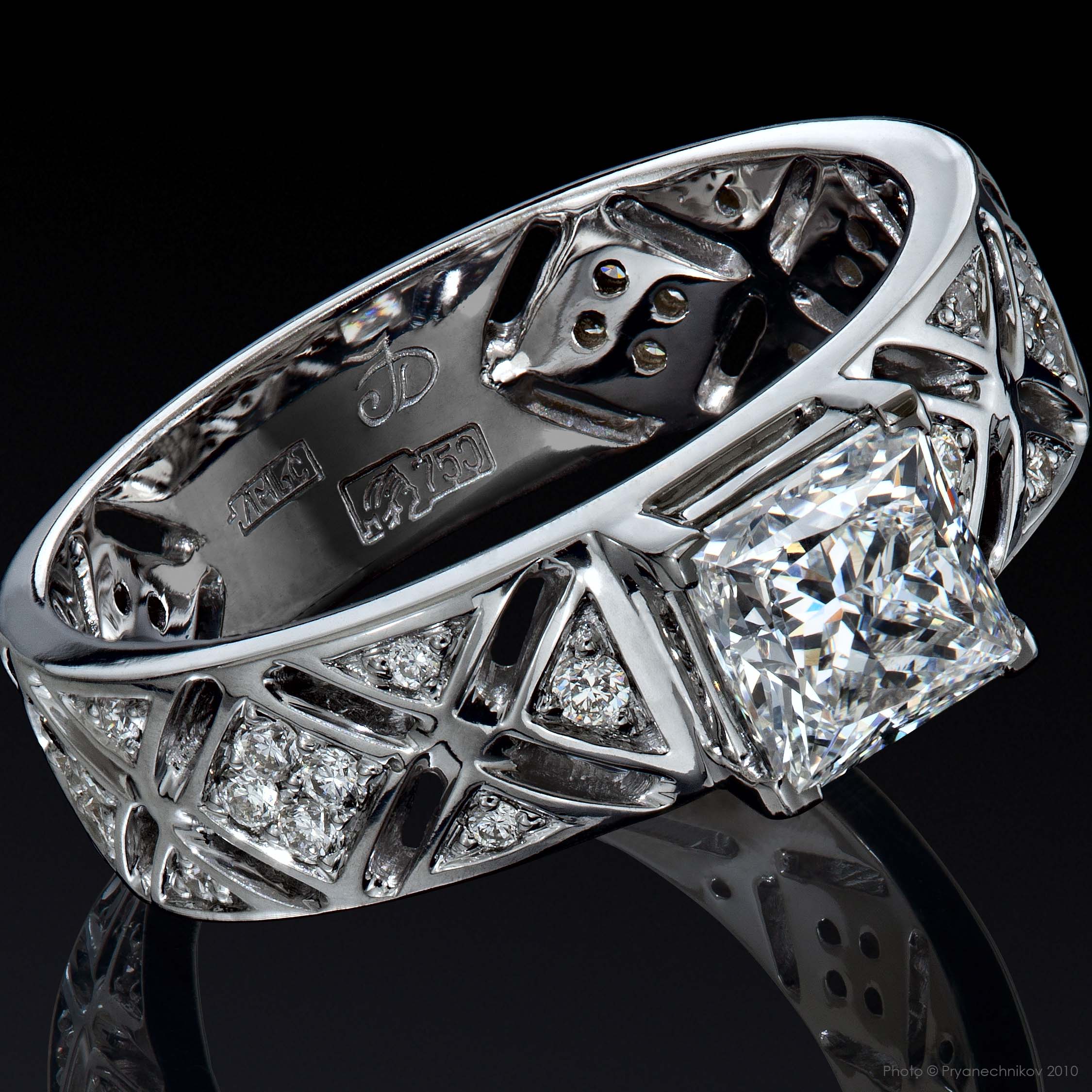 © «Izmestiev Diamonds». Кольцо из золота 750°, родированное, общий вес 5.69 г. Бриллианты - 1 шт. огранки Принцесса П65-1.01 ct GVS1; 38 шт. Кр57-0.39 ct 2/3А.