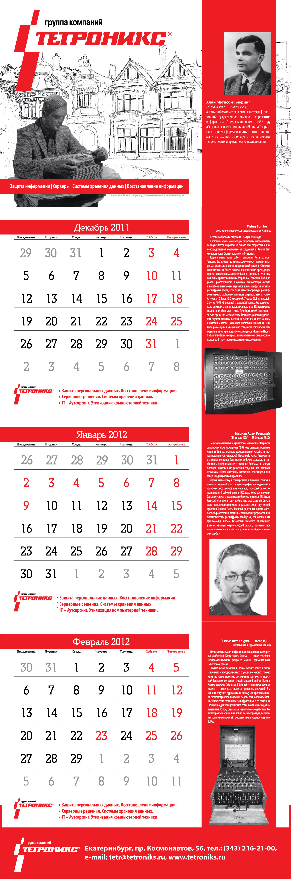 Идея календаря предыдущего года заказчику понравилась. Решил развить. В новом календаре на каждом месяце новый факт/персона/событие, так или иначе связанные с "главным героем" календаря Аланом Тьюрингом.