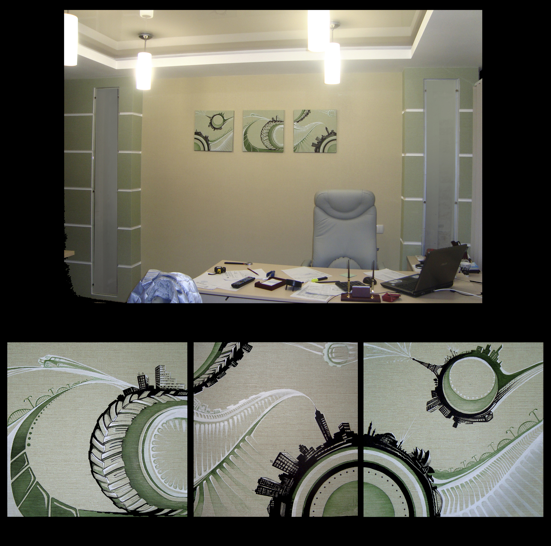 Разработка триптиха по тематике направленности фирмы. Ручная работа. Материал: планшет, обои, акрил.