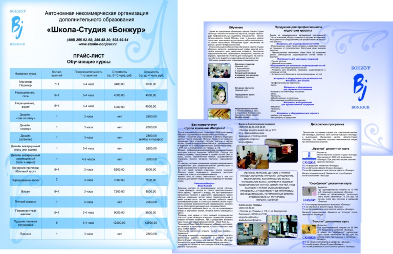 Дизайн и верстка прайсов и буклета для школы-студии "Бонжур"